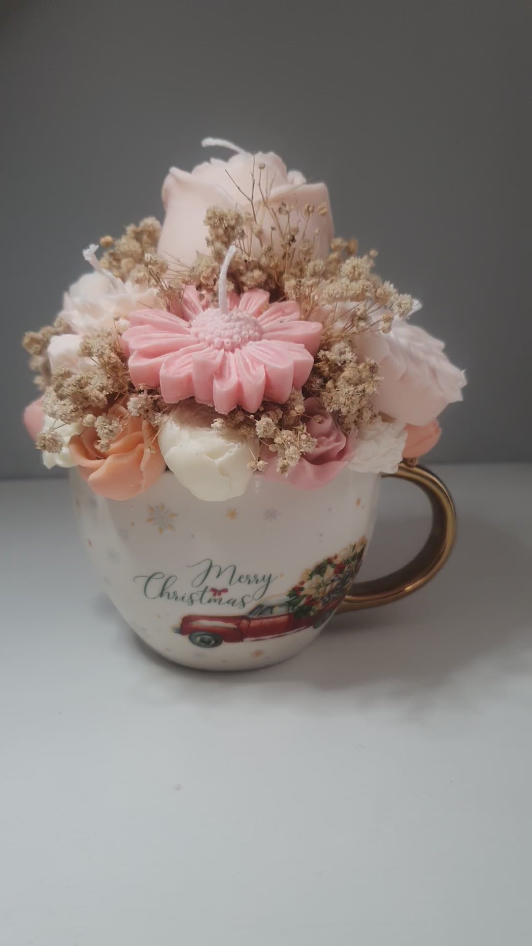 Kubek świąteczny z kwiatami z wosku sojowego z suszoną gipsówką